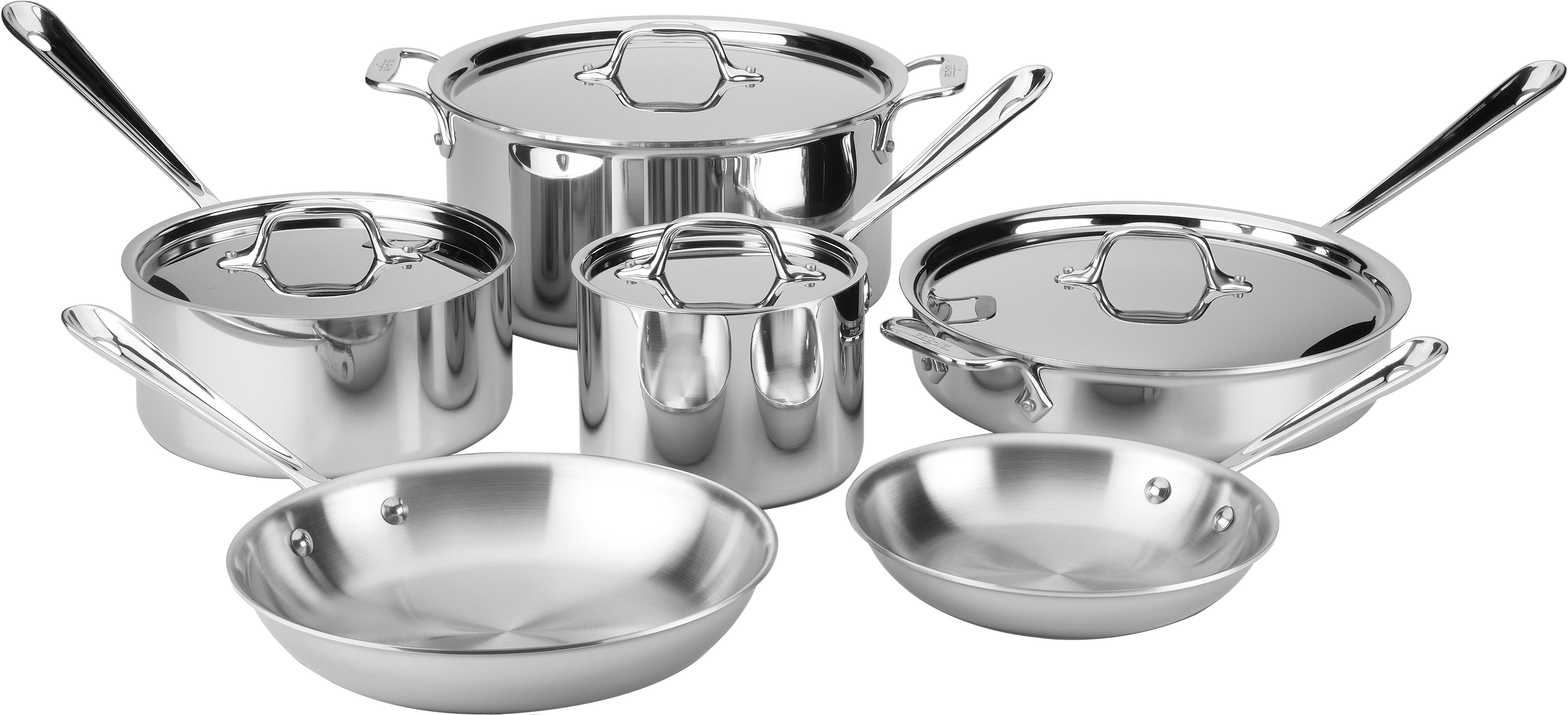 10pc Luxury Cookware set with 3-ply stainless steel construction. Includes 8" and 10" fry pans, 2-qt saucepan with lid, 3-qt saute pan with lid, 3-qt soup pot with lid, and an 8-qt stockpot with lid.Read More