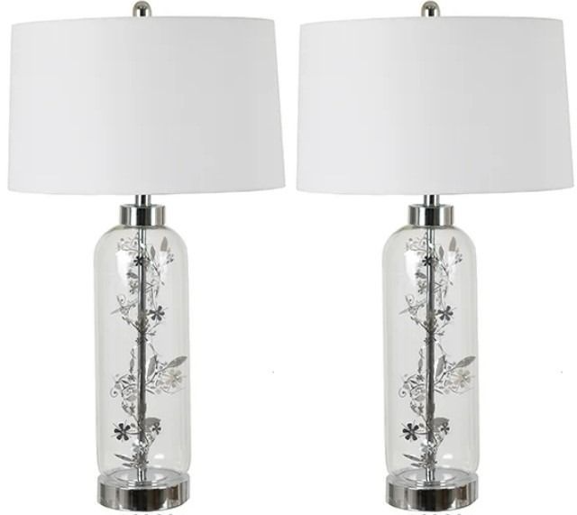 Add an eye-catching look to your living room or bedroom décor with this table lamp set from Crestview Collection. Shown in a chrome/white finish. This elegant and timeless lamp set is a great piece of décor for your home.Read More