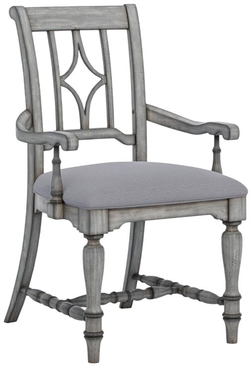 Create a lasting impression within your home with the Plymouth upholstered arm dining chair. The chair sports a whitewash finish and a diamond-shaped detail on the back panel.