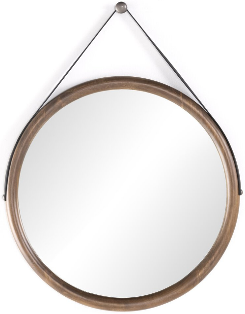 A simply shaped rounded mirror features toffee-colored top-grain leather and natural iron hardware