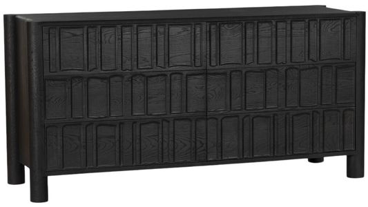 The Four Hands Ezri Carved Black Oak 6-Drawer Dresser combines functionality with artistic design. Crafted from solid black oak, it features six spacious drawers and intricate carved detailing on the front, adding texture and visual interest. Its bold black finish and clean lines make it a standout piece for any bedroom.Read More
