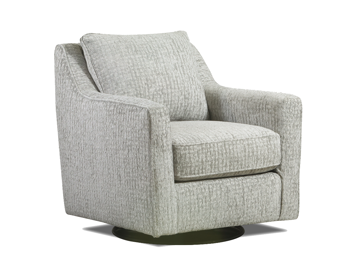 The sleek track arms continue up the arm post and are outlined with a small welt to give is flair and definition. This swivel glider looks small to fit in most any room but sits big for both men and women. The beautiful fabric makes this an attractive stand-alone chair or it blends perfectly with our Elise Mink Collection.