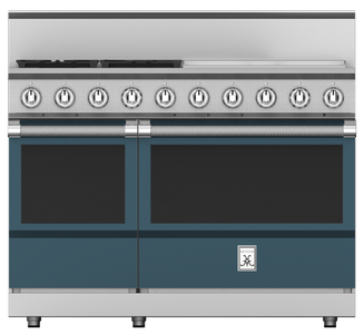 The Hestan 48" all gas range with 24" griddle provides searing culinary power with a sealed burner system delivering exceptional temperature control for culinary power up to 23,000 BTUs and as low as 500 BTUs. The high-performance oven features exclusive PureVection™ technology, which electronically controls multiple heating convection systems, to optimize baking, broiling, roasting and convection baking.Read More
