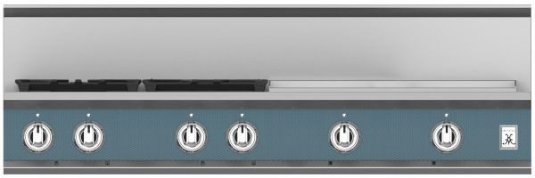 The 48” Hestan rangetop with griddle delivers searing culinary power with a sealed burner system delivering exceptional temperature control for culinary power up to 23,000 BTUs and as low as 500 BTUs. The 24” commercial-grade stainless steel gas griddle makes breakfast a cinch with superior heating and a thermostat for precise temperature control, while the continuous grates and backlit knobs combine stunning form and function.Read More