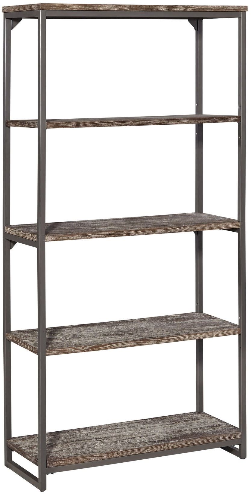 An alluring industrial design using mixed media materials gives this Barnside Metro Shelf by homestyles a cool vibe. Constructed of wire-brushed pine veneers over engineered wood in a multi-toned driftwood finish with metal tube framing in a powder-coated, dark grey painted finish. Features five impressive shelves, with the two middle shelves being adjustable.