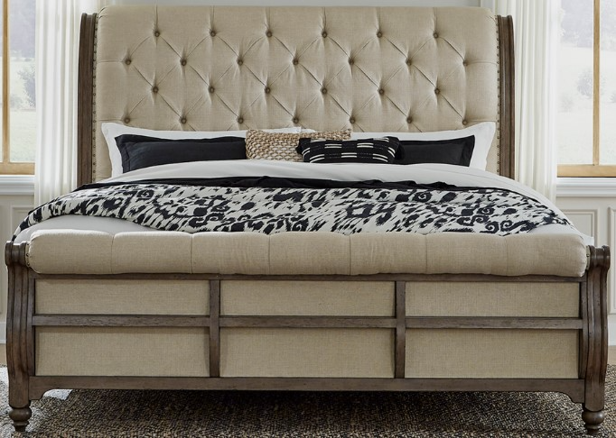 When details matter, choose the Americana Farmhouse king sleigh bed. Crafted of poplar solids with white oak veneers, this bed features a wire brushed dusty taupe finish with worm hole distressing.Read More
