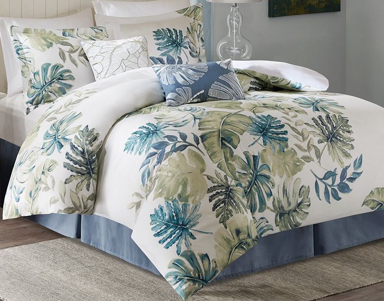 Awake in paradise with the Harbor House Lorelai 6 Piece Comforter Set. Showcased against a crisp white ground, gorgeous hues of green and blue compose a lush coastal pattern of oversized tropical plants. Two individually hand-cut shams bring the coastal pattern to the head of the bed, while the soft blue bed skirt adds a pop of color to the ensemble. Two decorative pillows follow the green and blue color palette and the coastal motif to pull the entire look together.