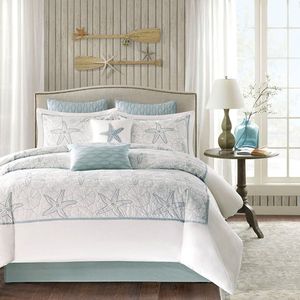 Bring the ocean into your home with the Harbor House Maya Bay Collection. A soft seafoam blue is the accent color used in this beach themed comforter and shams playing up the seashell and sand dollar embroidery. Made from 200 thread count cotton, this calming collection allows you to escape from reality in your own home.