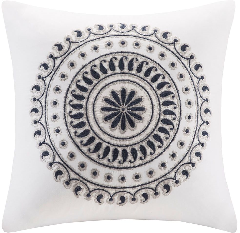 Perfect as a decorative pillow on your bedding or an accessory for your couch, the INK+IVY Fleur Square Pillow is versatile in any space. Its off white backdrop showcases an intricate medallion motif embroidered with navy thread for a pop of color.