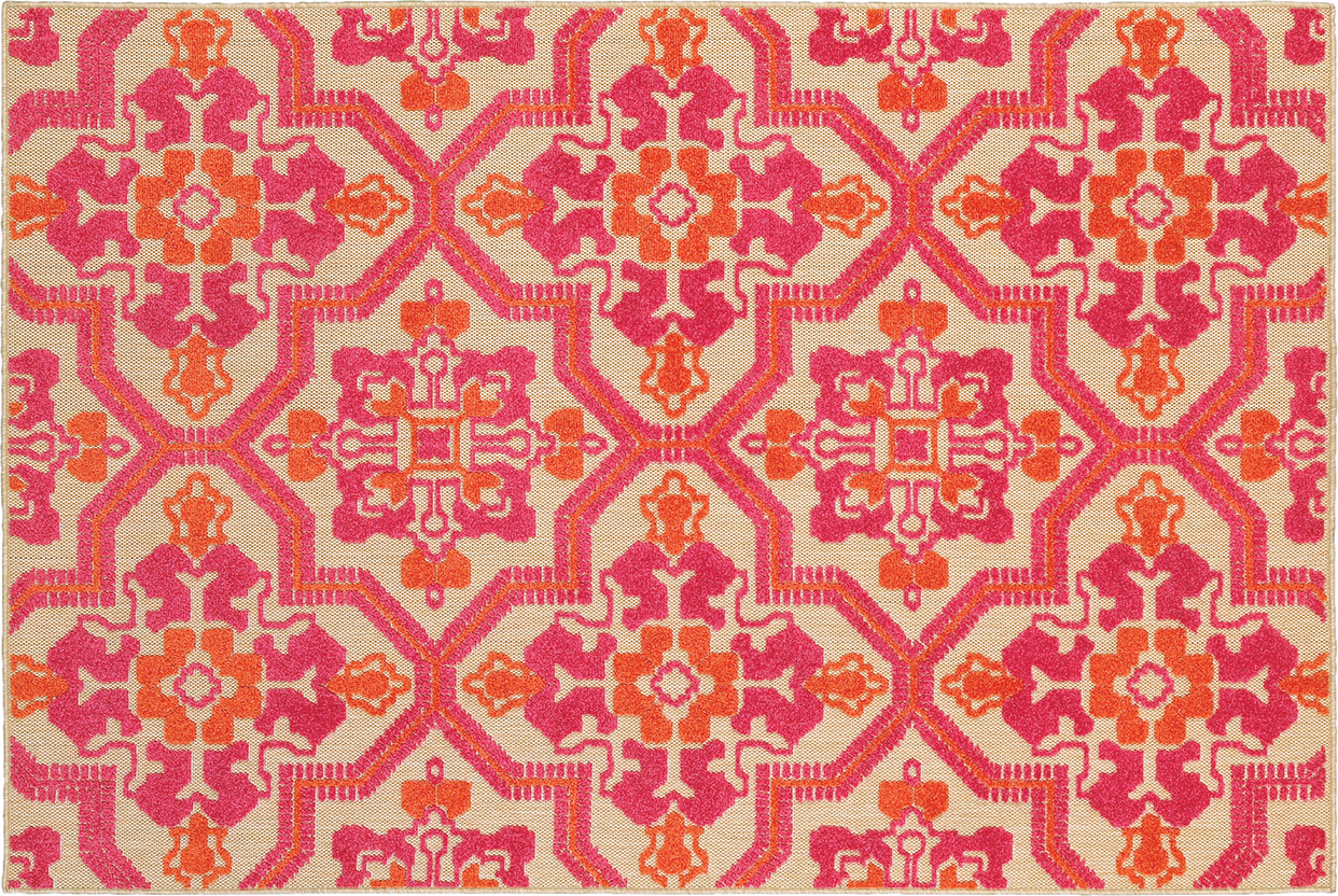 The Cayman collection is machine woven of 100% polypropylene featuring a high/low effect utilizing textured, tri-colored yarn in a multi-level cut pile and flat weave construction that can be used inside the home as well as outdoors. Vibrant shades of tangerine, lime, Mediterranean blue, cherry red, charcoal and bright strawberry pink pop on the natural sand colored background in crisp geometric and global inspired patterns.