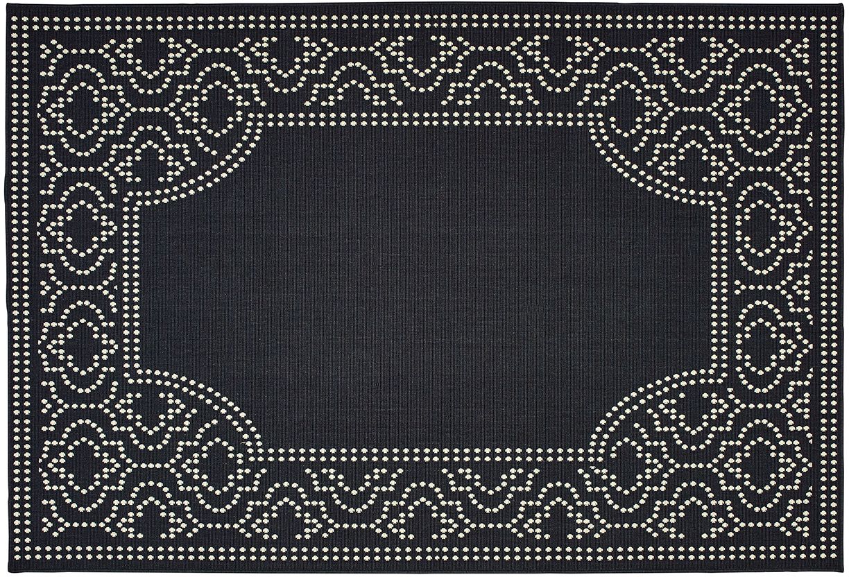 Marina is an elegant new introduction for indoor or outdoor use and features a 100% polypropylene looped yarn made in Egypt. It features a classic neutral palette using high contrast colors like black, ivory, deep navy, sand and cool gray. The collection includes casual but sophisticated patterns like updated geometrics and simplified traditionals that all feel fresh but timeless.