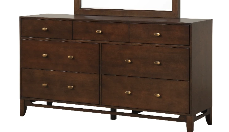 The Bowie Bedroom is a modern classic featuring sleek silhouettes, clean lines, and a rich dark cherry finish. The brass hardware, upholstered headboard, tapered posts, and bold cutouts elevate the Bowies Mid Century styleRead More