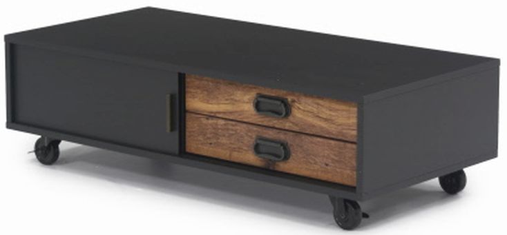 Enhance the look of your living room space with this coffee table from the Boulevard Café collection. This mid-century inspired table offers a spacious tabletop surface that is the perfect place for you to set your cup of coffee, the morning newspaper, display home décor, or to kick your feet up on while you sit back and relax. It features two easy gliding storage drawers that are ideal for stashing away board games, movies, coasters and other around home essentials. It also includes hidden storage behind the sliding door along with cubbyhole storage for all your additional storage needs. Its easy-roll, locking casters give it the ability to move wherever you feel it fits best. Finished on all sides in Black with Vintage Oak accents, this handsome coffee table gives your home the functionality that you need with the style that you have always wanted.