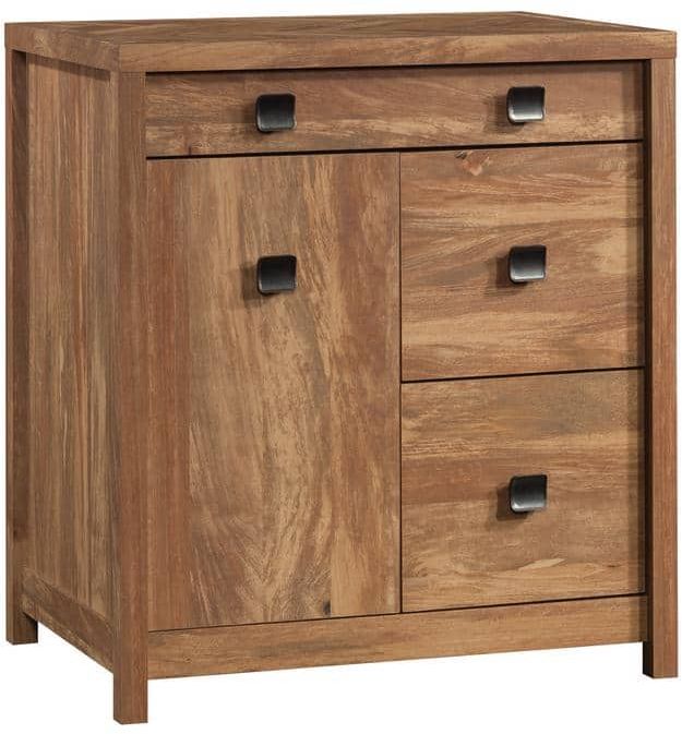 Is the lack of storage in your home office bringing you down? We can fix that! Create the additional storage options you need while adding the farmhouse style that you love with this office credenza with door from the Cannery Bridge® collection. This small credenza features a top surface that provides you with space to store and display items like plants, books, and photos of your family. The top features a herringbone pattern for extra detail. This versatile home office credenza also features three drawers with full extension slides. The top drawer has a flip-front with a large drawer/shelf for laptop storage, a keyboard, or your planner. The two file drawers of this office storage cabinet easily hold your most important letter-size hanging files. Behind the door is an adjustable shelf that can move to different heights to create flexible storage for items of all shapes and sizes. Finished in Sindoori Mango®, this stunning storage credenza is just what your home office is missing.
