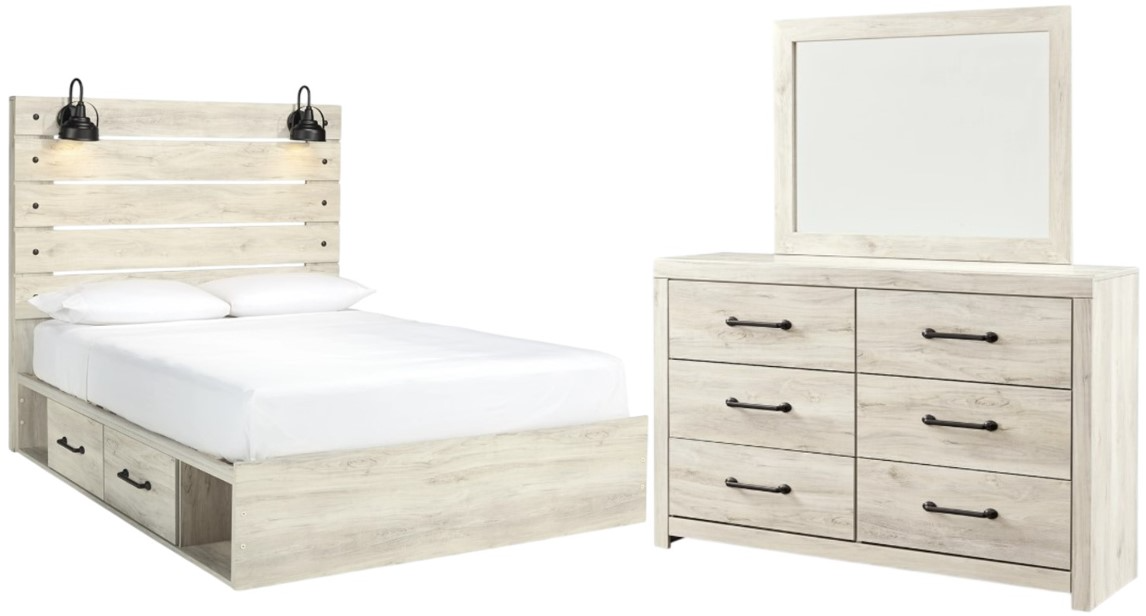 Includes headboard, footboard, side storage, rails and slats, dresser and mirror