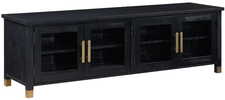 Its low-profile design is crafted for the ideal TV viewing experience. Perfectly sized at 64 inches in length, it holds up to a 75-inch television with grace. Glass doors allow for effortless remote control of electronics in the cabinet.